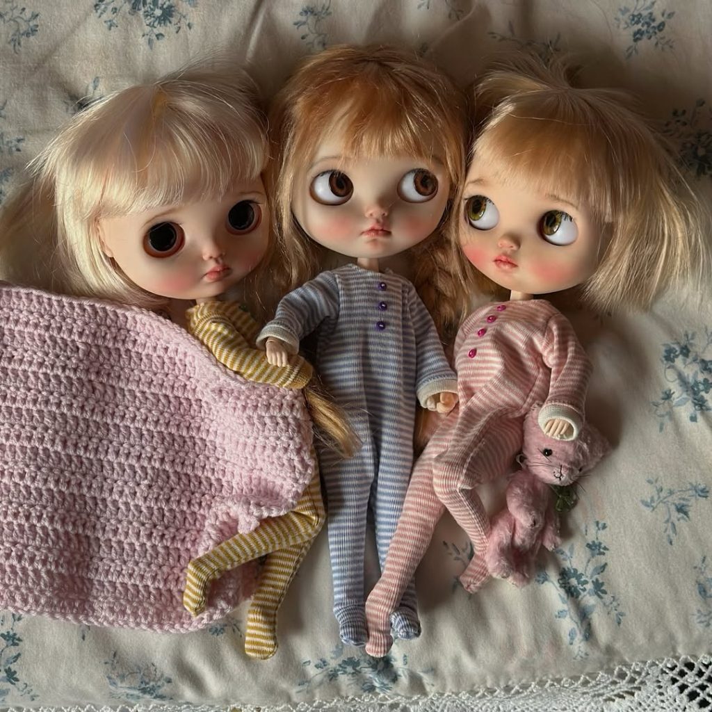 Picture this: Your Blythe doll snuggled into a miniature bed, wearing ruffled white pajamas, her lashes half-closed, a plush rabbit tucked under one arm. It’s bedtime magic in miniature.