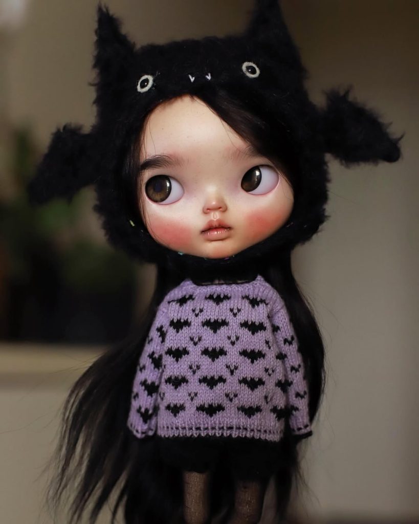 A hand knitted jumper in soft tones (think cream, lilac, or robin’s egg blue) adds both warmth and texture. Layer it over a Blythe doll dress for a sweet cottagecore aesthetic.