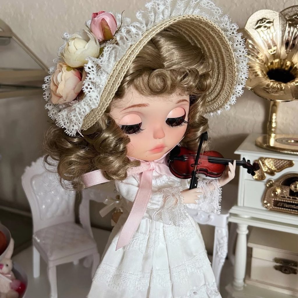 A Blythe doll with long blonde hair shines in a vintage style hat and soft lace dress. Think Victorian elegance meets modern charm.