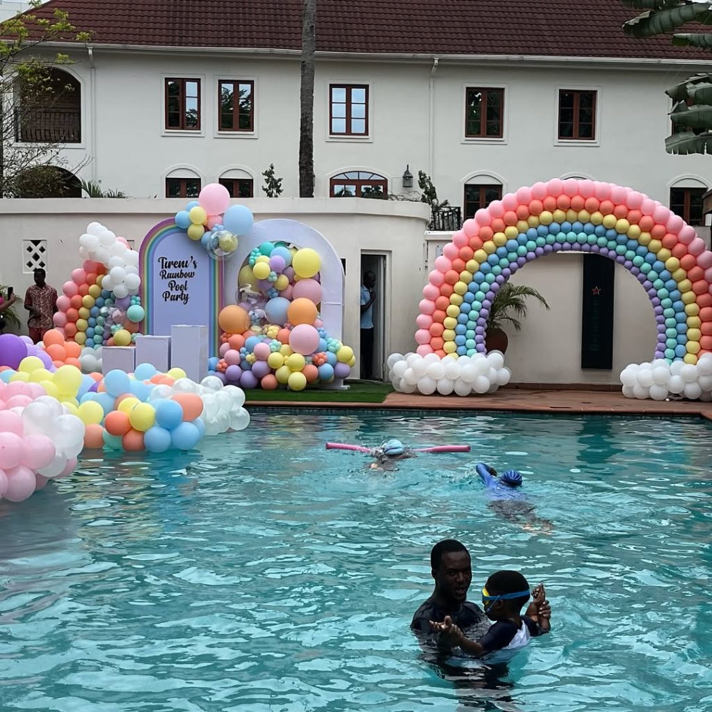 Your pool is dotted with bold, colorful floats—one shaped like a swan, another like a rainbow lounger—creating the most fun, playful pool background for all those candid pool party pictures.