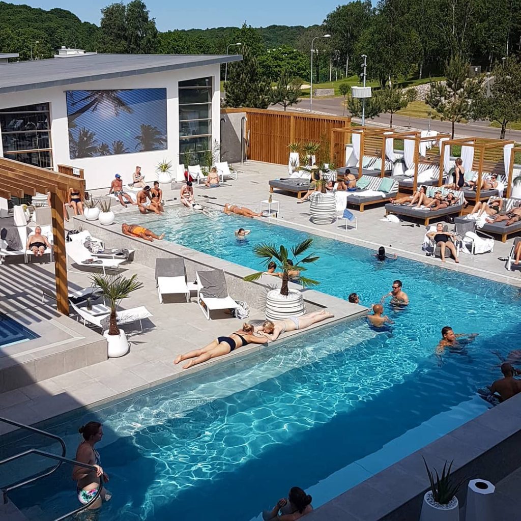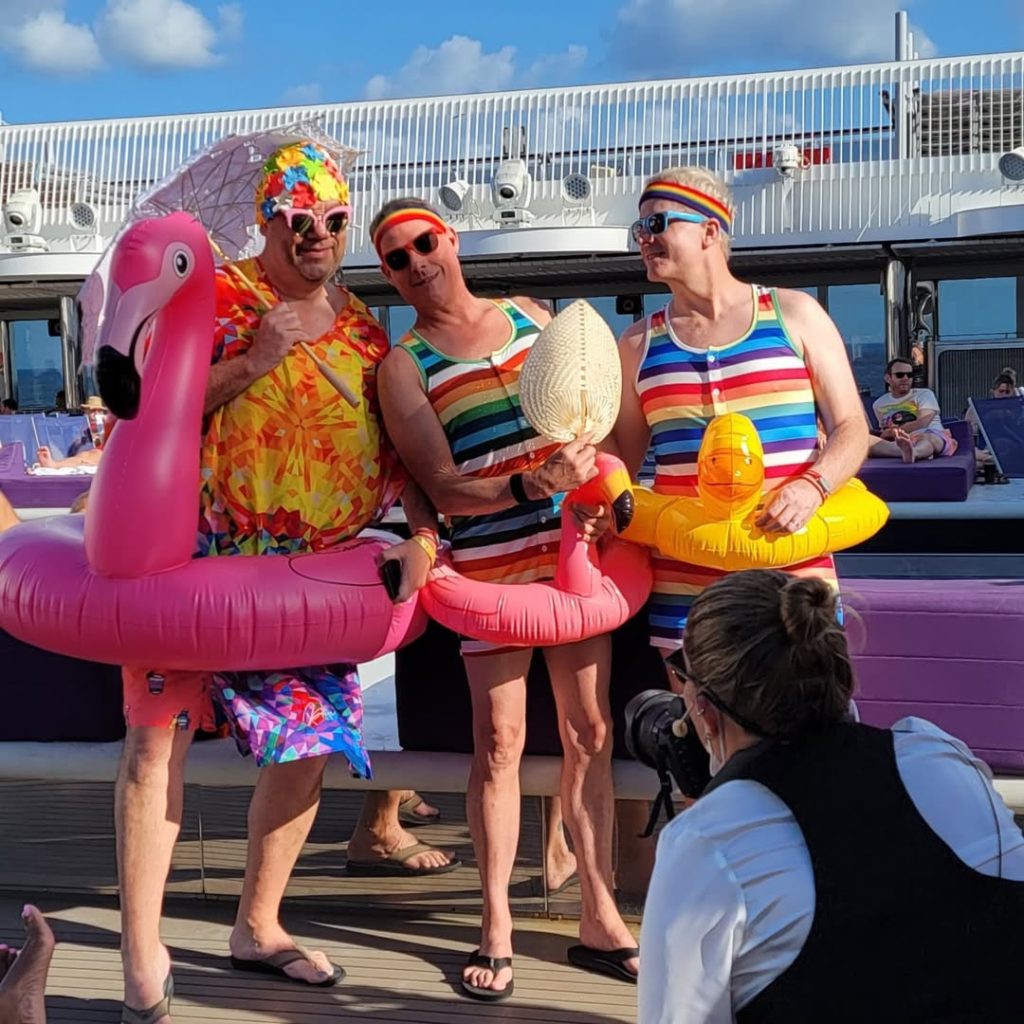 Everyone’s chilling in colorful chairs with oversized sunnies and iced drinks, feeling like they’ve landed at a Cabo pool party resort.