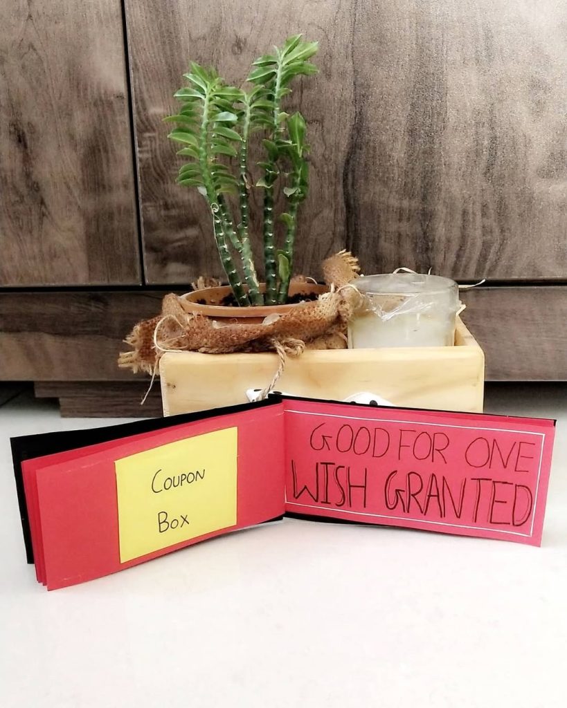 Now imagine him flipping through the book — “Redeem for One Back Massage,” “Redeem for a Lazy Sunday Together,” “Redeem for Me Not Complaining During Football.” It’s playful, fun, and filled with love.