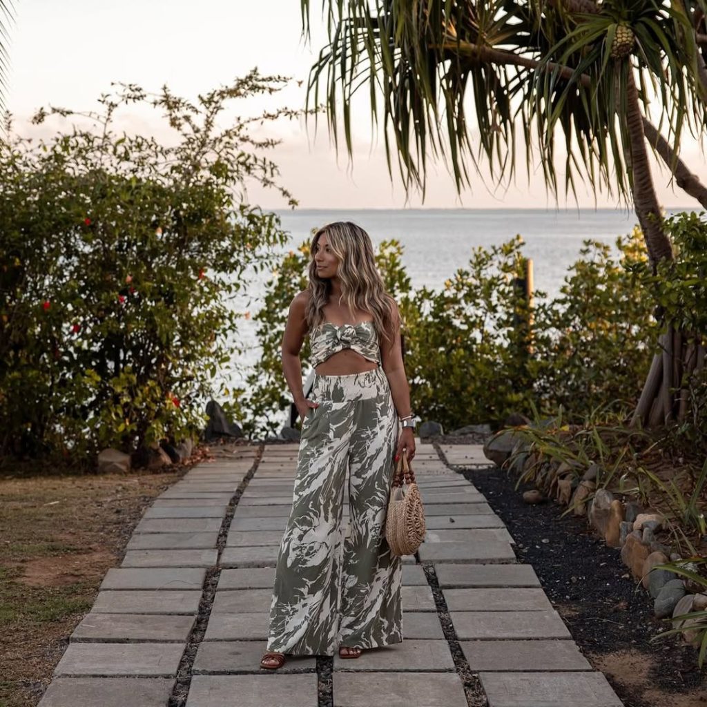Island breeze tousles your hair as you pose by swaying palm trees in Jamaica, your matching set covered in tropical prints that scream “vacation mode activated.”