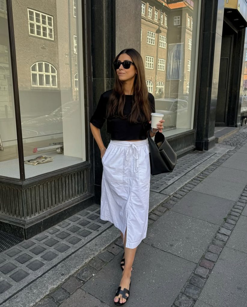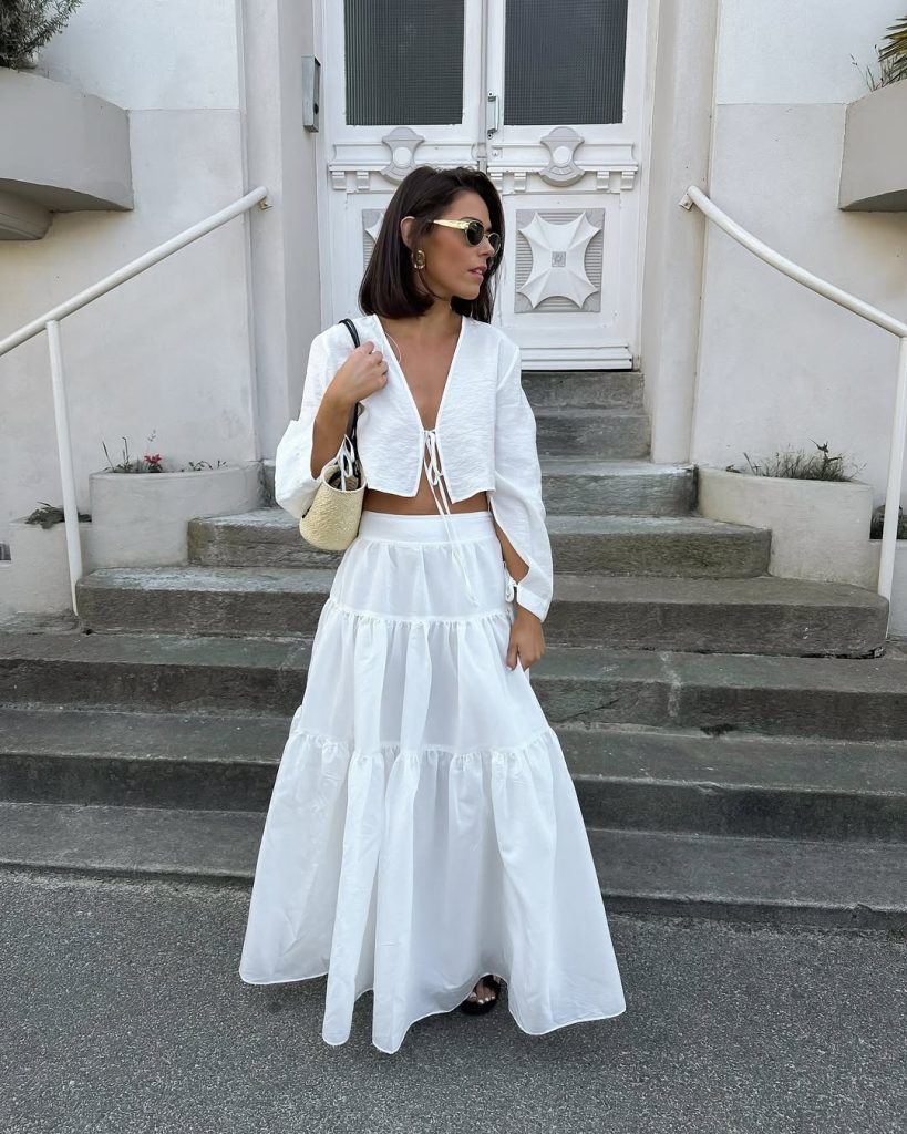 A long white skirt paired with a cropped top or tied button-down feels breezy, beachy, and just a little boho. Think island honeymoon vibes or Greece travel photos.