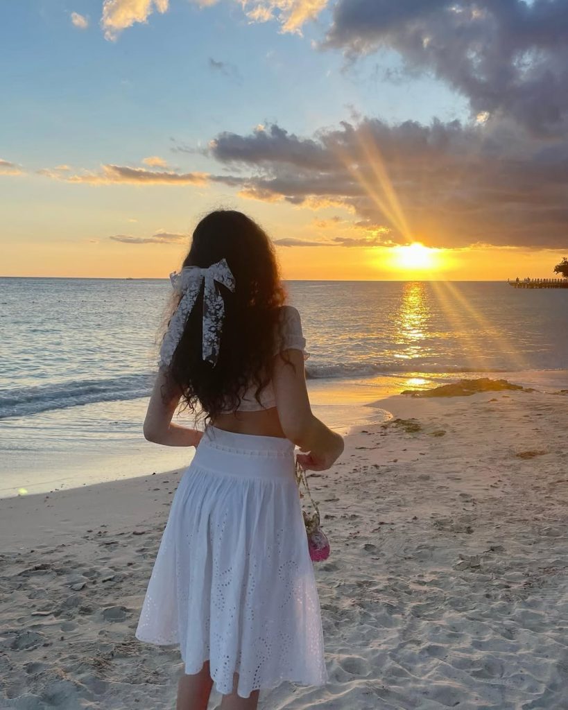 Mix delicate, girly pieces like lace, bows, or puff sleeves with classic beachwear for an outfit that’s soft, feminine, and a little playful.