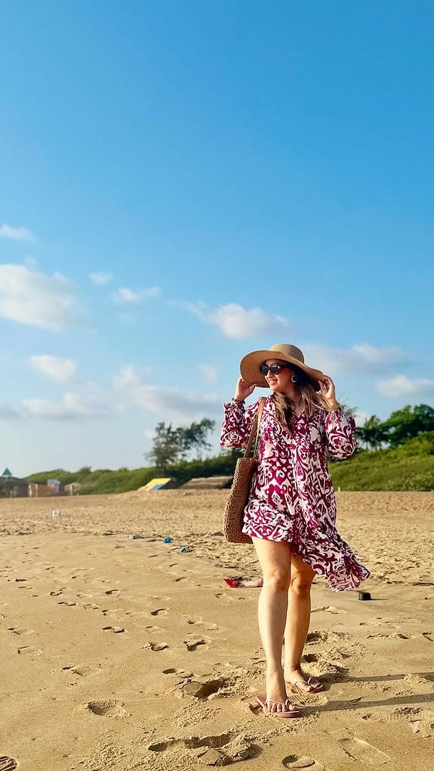 The breeze catches the hem of your printed maxi dress as you walk barefoot in the sand, golden hour lighting up your skin. Your sun hat dips just low enough for that perfect over-the-shoulder vacation photo.