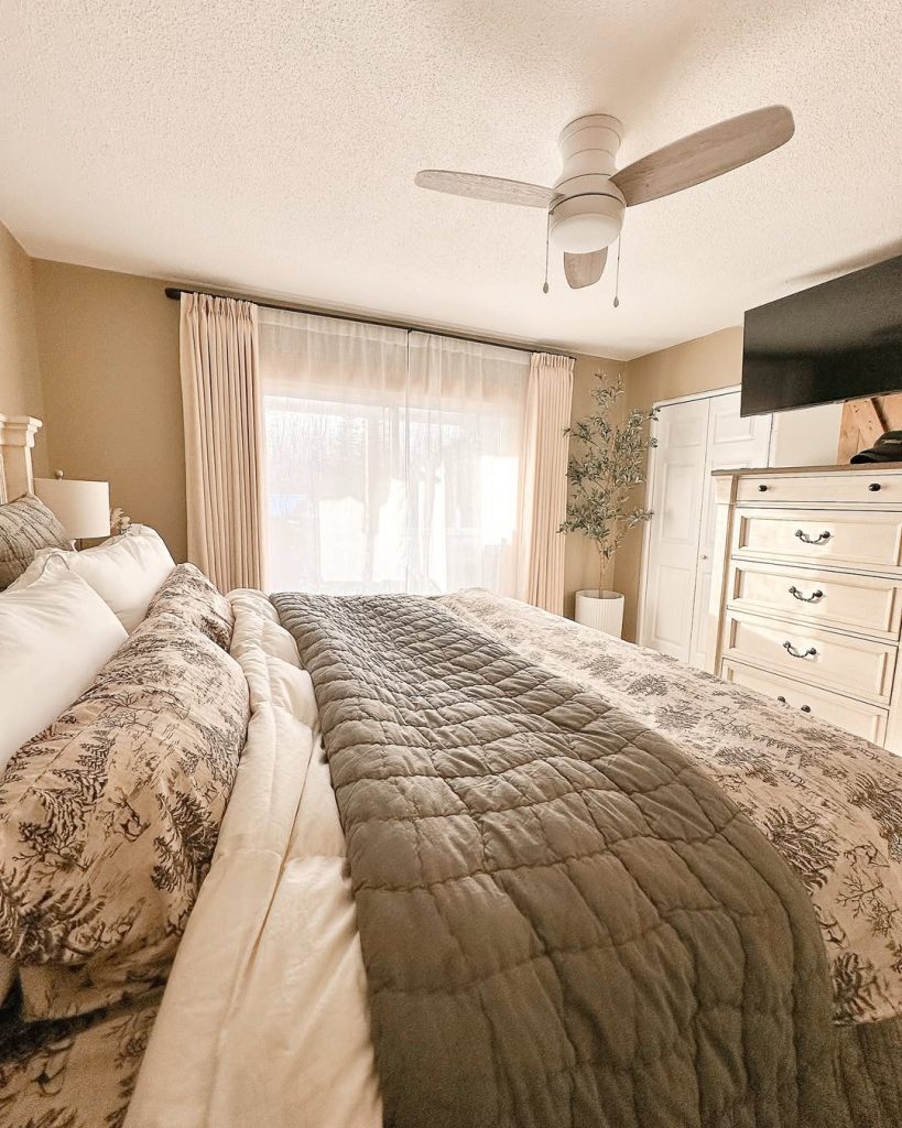 Picture this: A bed layered with a sage green duvet, a chunky knit throw at the foot, and vintage floral pillows. It’s effortlessly undone, yet beautifully styled—the kind of bed that begs you to dive in.