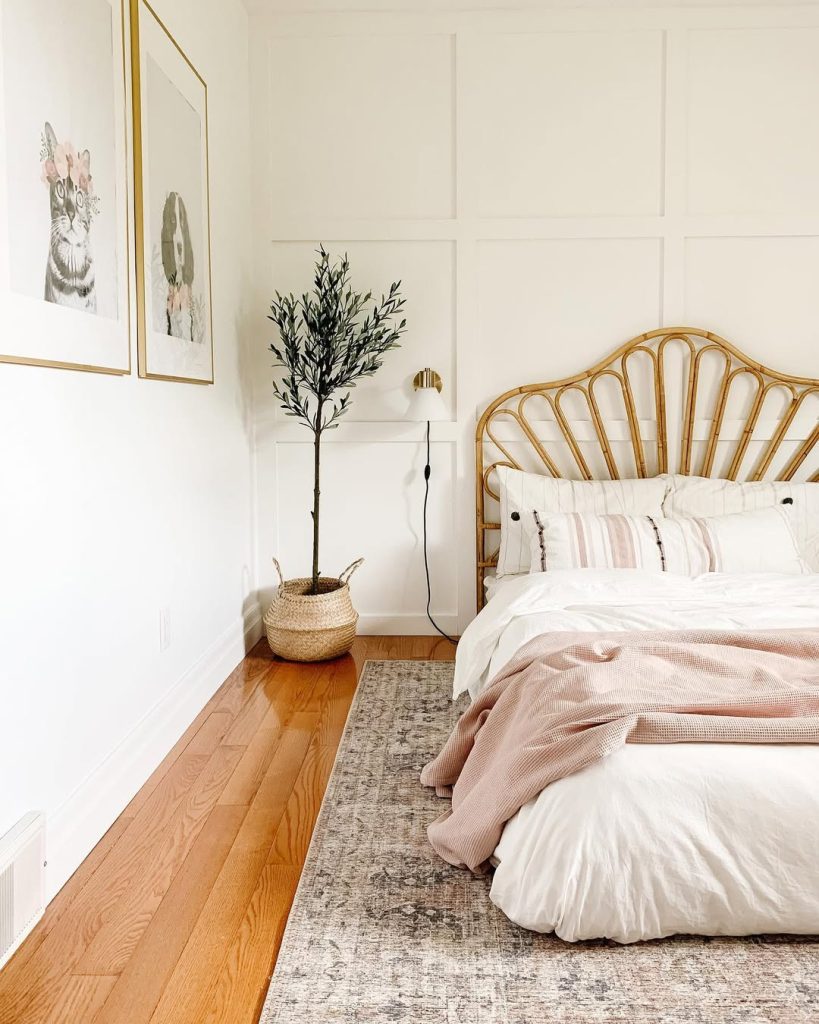 Picture this: A rounded rattan headboard, paired with crisp white bedding and textured pillows, grounded by a jute rug. Light filters in through sheer curtains and everything feels light, warm, and full of life.