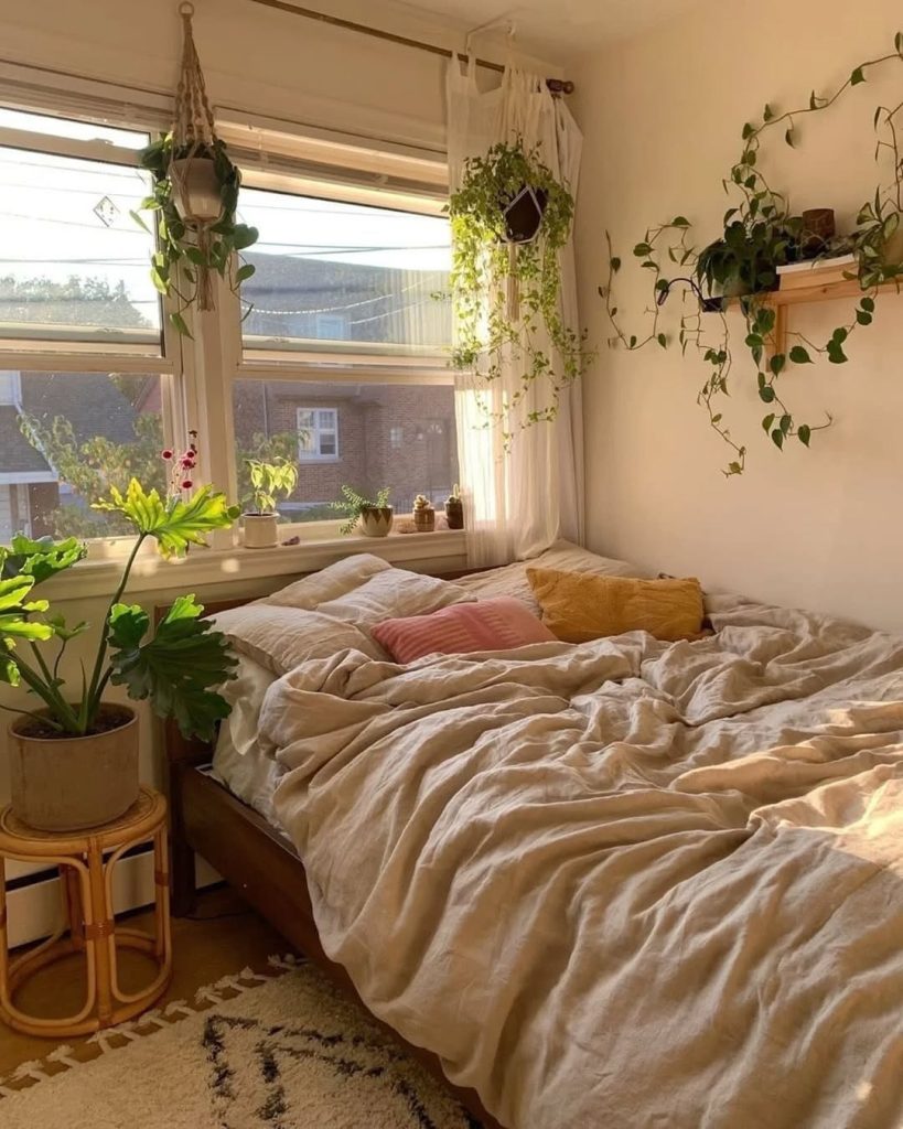 No boho bedroom is complete without plants. Hanging plants like pothos, string of pearls, or spider plants bring height and organic movement.